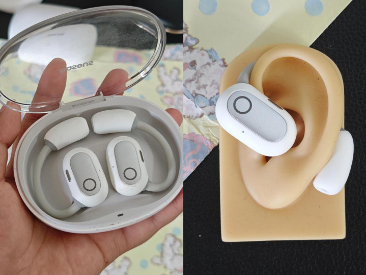 耳挂的材质是液态硅胶,上耳的稳固性比较好,但是耳挂的设计比较细长,且单耳重量也有9克左右,长时间戴着会有点压耳朵,所以我觉得耳部敏感的人可以多考虑一下,但同时耳挂细也会有有点,就是可以和框架眼镜一起使用!