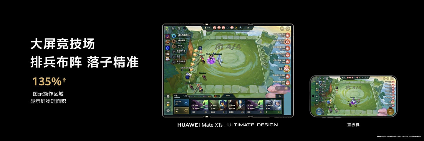 新一代三折叠屏手机华为 Mate XTs 非凡大师,以其独特的超宽屏设计彻底突破了传统手机的视野边界,横向可视面积提升超过 50%,真正实现了移动游戏中的“视野革命”。在本次发布会上,华为特别邀请了《金铲铲之战》作为重要合作伙伴站台,双方携手展示了三折叠形态在策略竞技类游戏中的畅爽视界体验。