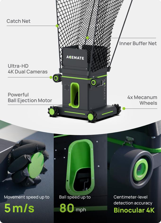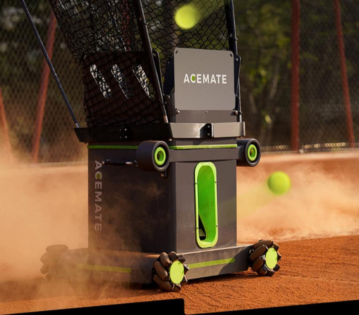Acemate网球机器人配备双目4K摄像头和全向轮,移动速度可达5m/s,配合AI视觉跟踪,能够像真正的对手一样移动、接球和反击等,让单人训练变得更加真实。