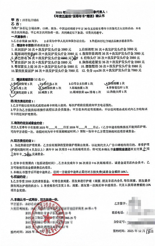 根据李女士提供的《形象代言人确认书》扫描件,记者看到条文中确有相关条款。李女士透露,协议原件由店方保管,自身仅持有手机扫描件。此前,美容院一度回复“年后处理”,后又表示只要同意扣除违约金即可退款。目前,李女士已拨打12315反映情况。