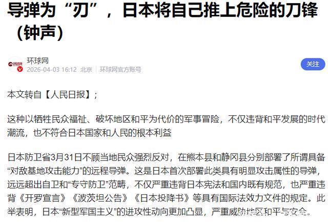 4月5日傍晚,东京池袋站前,日本多名在野党高层与大量民众举行集会,抗议高市早苗政府为武器出口“松绑”以及进行大规模军事扩张等危险政策,甚至催促高市交权下台。 早在3月27日,冲绳县议会也曾通过反战意见书,明确反对日本政府向冲突地带派遣自卫队。 这意味着,高市推进修改“防卫装备转移三原则”、试图为武器出口松绑的图谋,正遭到民众和在野党的阻击。但日本防卫省一意孤行,无视当地民意的激烈反对,在熊本县和静冈县,强行部署了所谓拥有“对敌基地攻击能力”的远程导弹。 反战的抗议声浪与高市政府的扩军步伐,正在形成一种越来越尖锐的对峙,高市政府正在面临一场合宪性危机。 4月5日傍晚的东京池袋站前,上演了一幕压倒性的抗议场景,超过六千名日本民众从四面八方赶来,多名在野党高层也亲自到场,大家目标高度一致:抗议高市早苗政府为武器出口“松绑”,反对大规模军事扩张,直接要求高市早苗交权下台。现场的抗议者举着“武力换不来和平”“反对战争”“守护和平宪法”的标语,呐喊声盖过了街头的车流声,没有丝毫妥协的余地。 这场集会绝非偶然的零散抗议,而是日本民间对政府背离和平路线的总爆发。高市早苗上台后,一门心思要修改“防卫装备转移三原则”,说白了就是想拆掉日本战后坚守的武器出口枷锁,让日本的军火能随意流向海外,甚至介入地区冲突。 在普通日本民众心里,和平是战后几十年最珍贵的成果,谁要打破和平、推动国家走向战争,谁就会被民众抛弃。在野党也看清了民意所向,站到民众一边公开施压,催高市交权的声音,成了东京街头最响亮的政治信号,也意味着高市的扩军路线,已经失去了最基本的民意支撑。 冲绳反战+导弹硬部署日本扩军陷入双重危机 东京的抗议声还未平息,日本地方与中央的对立、民意与政策的冲突已经愈演愈烈。早在3月27日,冲绳县议会就全体通过了反战意见书,明确反对日本政府向冲突地带派遣自卫队,也反对提供任何形式的军事支援。冲绳是二战中遭受战争创伤最深的日本地区,当地民众对战争的恐惧、对和平的渴望刻在骨子里,县议会的这份意见书,不是简单的地方诉求,而是日本热爱和平的民众的集体心声。 可面对如此清晰的反战民意,高市早苗政府和日本防卫省却选择视而不见、一意孤行。高市推进修改“防卫装备转移三原则”的图谋股票配资程序,本就遭到民众和在野党的层层阻击,防卫省更是顶着熊本县、静冈县民众的激烈反对,在3月31日强行部署了具备“对敌基地攻击能力”的远程导弹。这些导弹早已超出“专守防卫”的范畴,是实打实的进攻性武器,完全违背了日本和平宪法的核心精神。 一边是全国各地此起彼伏的反战抗议,一边是政府铁了心的扩军步伐,两者的对立越来越尖锐,高市早苗政府也陷入了严重的合宪性危机。民众不认可、地方不支持、法理站不住脚,日本政府的军事扩张,从一开始就走在了违背民意、违背宪法的歧途上股票配资程序,所谓的“国家安全”,不过是右翼势力复辟军国主义的借口,最终只会把日本推向危险的深渊。 长期以来,中方对日本右倾化的批评,大多停留在具体政策层面,比如参拜靖国神社、修改历史教科书、发表歪曲历史的不当言论等,都是就事论事地指出问题、提醒日本回归正轨。 但这一次,4月3日人民日报发表的评论文章,直接完成了定性升级,不再局限于单个政策的批判,而是从日本国家战略走向的高度,直指其“新型军国主义”妄动的狂躁,明确表态这一动向非常危险。 文章还从国际法、日本国内法、历史逻辑三个维度,把日本的危险做法剖析得明明白白。从国际法来看,日本强行部署进攻性导弹、放宽武器出口,违背了《开罗宣言》《波茨坦公告》等战后国际秩序的核心准则;从国内法来讲,这些举动彻底突破了和平宪法“专守防卫”的底线,是对日本战后法治体系的践踏;从历史逻辑上说,日本曾经的军国主义给亚洲各国带来了深重灾难,如今重走军事扩张老路,是在公然无视历史教训、挑战地区和平稳定。 这次重磅定性,标志着中方对日本战略走向的警惕,已经从具体政策层面,上升到了对国家整体发展方向的深度担忧。日本的“新型军国主义”狂躁,不再是小范围的右倾苗头,而是实实在在的地区安全威胁,不仅伤害亚洲邻国的情感,更会让日本自身陷入孤立,最终自食恶果。 日本政府走到今天这一步,完全是为自己的对抗思维、军国主义狂想买单。放着和平发展的道路不走,非要执着于军事扩张,一边无视民众的反战心声,一边突破战后秩序的红线,最终只会被民意抛弃,被国际社会孤立。 东京的集会、冲绳的反战、权威媒体的定性,都是在给日本敲响警钟:清算已经开始,执意推行激进路线,只会让日本重蹈历史覆辙。只有回归和平宪法的初心,放弃军国主义迷梦,倾听民众的真实诉求,日本才能守住来之不易的和平,找到真正的发展出路。 参考文章: