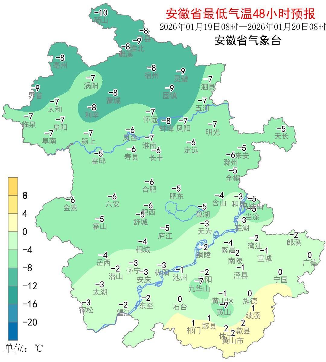 1月18日,安徽省气象部门连续发布寒潮黄色预警和暴雪黄色预警。预计19—21日受强冷空气影响,全省平均气温将下降13℃~15℃,局部下降超过15℃。21—22日最低气温:淮河以北-12℃~-9℃;江淮之间-8℃~-6℃;江南-5℃~-3℃。同时全省平均风力增至4~5级,阵风7~8级。