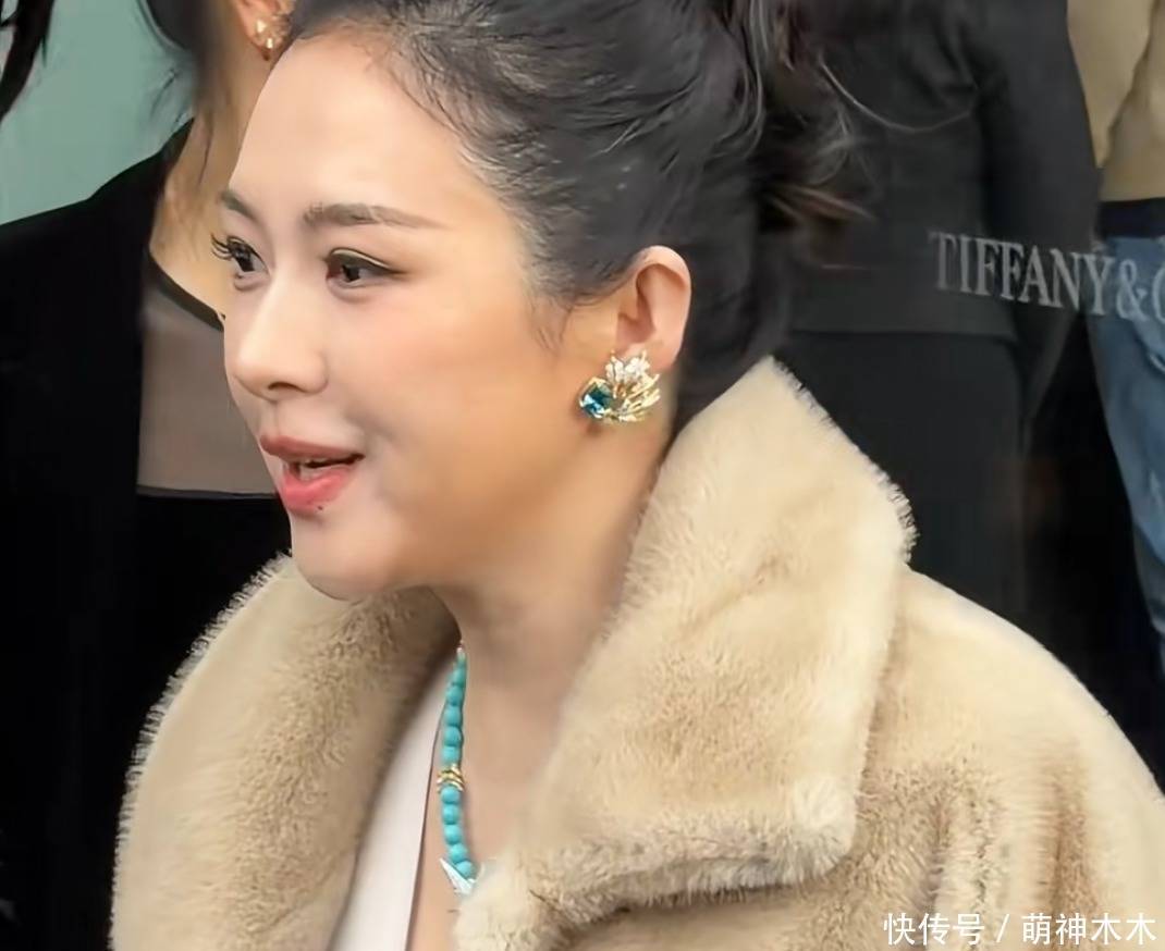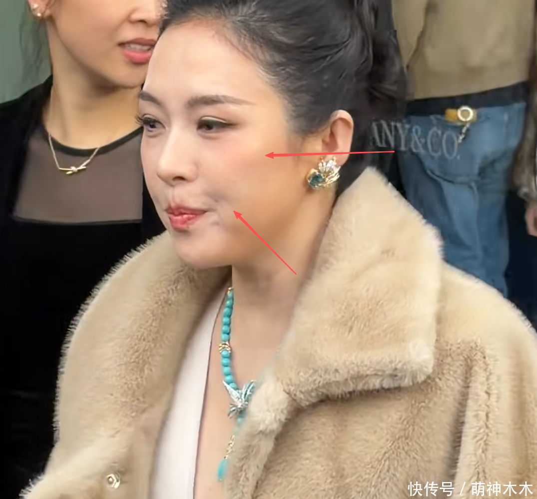 先来看章子怡的妆容,她把头发全部盘起来了,整张脸都露了出来。只是妆容实在草率,乍一看以为章子怡瘦了美貌回春,久盯两眼发现是用化妆技术遮掩面部发福的状况。