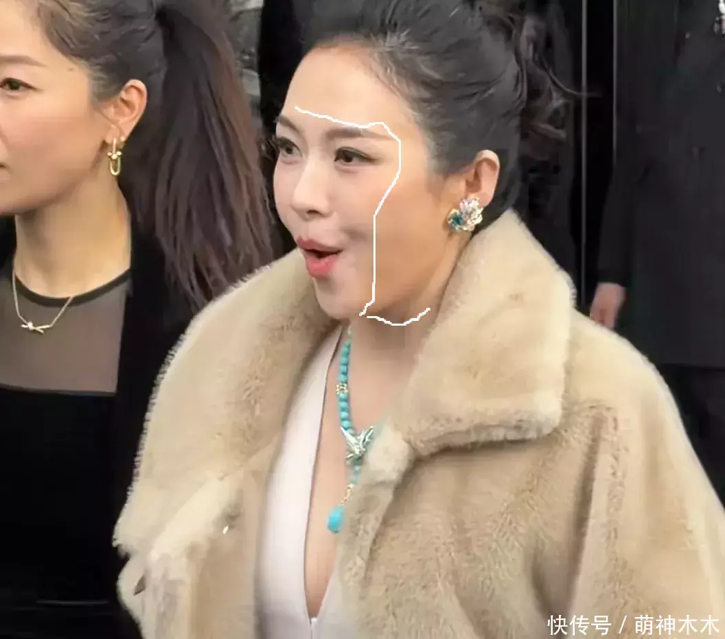 正脸的部分,也能看到章子怡面中占比是一个倒三角形,粉底比周围白多了。